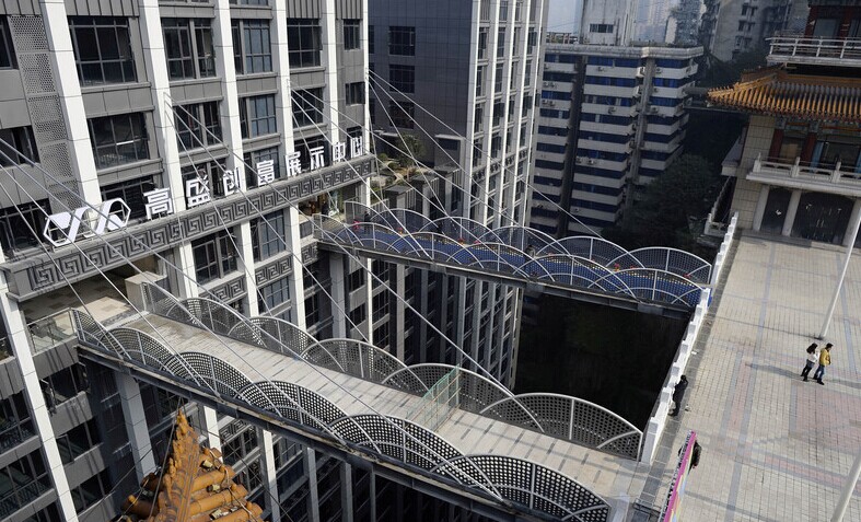2014年12月29日,重庆解放碑附近一新建楼盘,为了出入方便,在22层高楼的外墙上,分别搭建了两个钢结构的人行天桥。