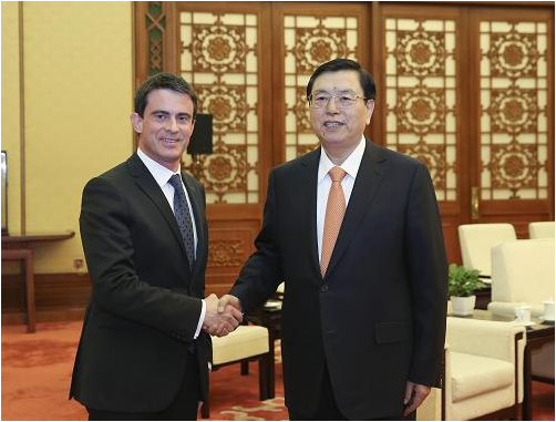 全国人大常委会委员长张德江今天在人民大会堂会见了法国总理瓦尔斯。