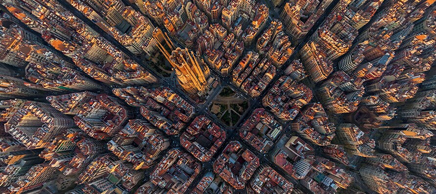 西班牙巴塞罗那:城市与伟大建筑师安东尼奥·高迪的名字紧密相连。摄影师在航拍过程中力争将高迪所有著名的建筑物收入其中,凸显城市设计之美。画面正中间的圣家族大教堂,从1882年开始建造,直到现在都没有完工。