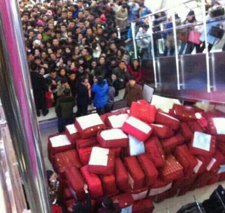 1月3日上午10时许,数百市民前往位于延安双拥大道中段的“延百东大上品”商场,拿手机展示商场所要求集的38个微信“点赞”,争着领取床上用品。