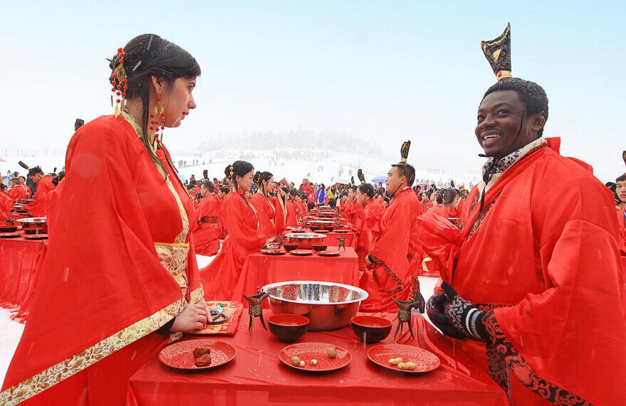 2014年12月27日,重庆武隆第六届仙女山冰雪童话节激情开幕,通过前期面向广大游客招募的99对新婚夫妻,在开幕式当天举行了盛大浪漫的汉式雪地集体婚礼,其中不乏外国友人及黄昏恋老人。图为参加婚礼的外国夫妇。