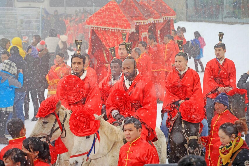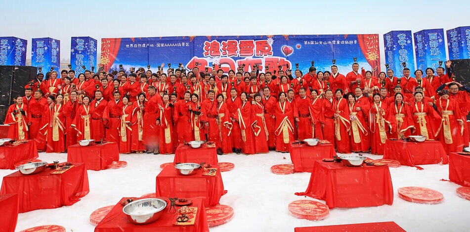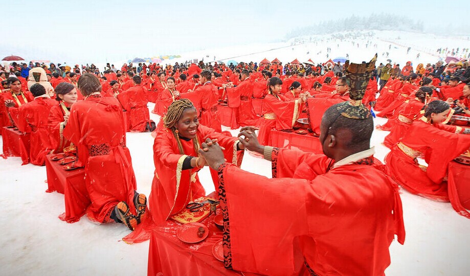 “大红花轿、迎亲仪仗队、拜天地、掀盖头、凤冠霞帔、蟒袍玉带……”传统的汉式结婚元素和白雪皑皑的雪景风光,为仙女山增添了不一样的色彩。本届雪地集体婚礼还将申报吉尼斯世界纪录。